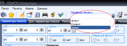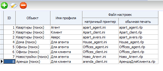 Профиль печати - это настроечный файл и запись в таблице, в файле указаны параметры печати: ширина столбцов, какие столбцы должны быть выведены на печать и т.д.. Для каждого участка программы (аренда, квартиры, дома, офисы и т.п.) существует свой набор профилей. Присвоить какому-либо участку (офисы, дома и т.п.) заранее созданный в конструкторе отчетов настроечный файл, можно в справочнике Профили печати (меню "Справочники->Общие...->закладка Профили печати").
