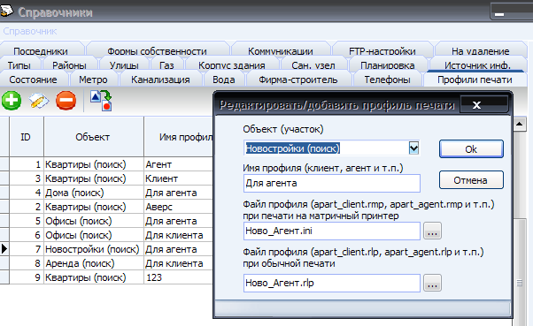 В открывшемся окне выберите из выпадающего списка участок, как то: офисы, дома, аренда, квартиры, посредники, новостройки. Введите имя профиля, например, "Для клиента" (это имя профиля Вы будете видеть на формах поиска при выборе профиля из выпадающего списка) , введите имена файлов профиля без путей, например, offices-client.rmp или выберите ранее созданные файлы профиля (использую кнопки с многоточием справа от полей ввода). И нажмите кнопку Ок для сохранения. Для имён файлов рекомендуется использовать расширения: *.RMP для профилей матричного принтера, *.RLP - для профилей обычной печати.