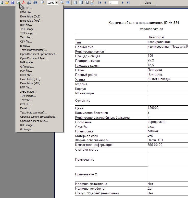 Як бачите, експорт картки можна виконати в безліч форматів. Є можливість виконувати друк з усіма фотознімками обраного об'єкта нерухомості.